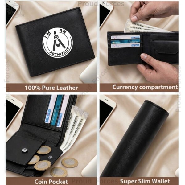 The Architect Black Leather Wallet for Men (Premium Classic Edition) from Proud Forces is carefully crafted for professionals who value premium leather quality, organized storage, and timeless everyday style. Made from 100% genuine black leather, this wallet offers durability, a smooth premium finish, and reliable long-term use. The Architect sticker placed at the center adds a distinct professional identity while keeping the design elegant and refined.