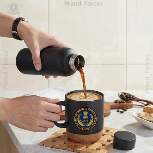 The CAPF Veteran Matte Finish Bottle & Coffee Mug Combo Set by Proud Forces is a premium daily-use combo designed for durability, comfort, and smart everyday utility. Both the insulated bottle and coffee mug feature a centered CAPF Veteran sticker, creating a matching identity-inspired design suitable for office, travel, home, and gifting. The bottle provides long-lasting temperature retention, while the mug includes a removable cork base and leak-proof lid for convenient daily use.
