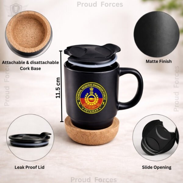 The GREF Veteran Matte Finish Coffee Mug with Cork Base by Proud Forces is a premium black matte finish mug designed for daily comfort, practical use, and identity-focused style. Featuring a centrally placed GREF Veteran sticker, this mug comes with an attachable and detachable cork base, making it easy to use and simple to clean. Its leak-proof lid and slide opening design make it suitable for tea, coffee, and other beverages at home, office, travel, or daily routine.