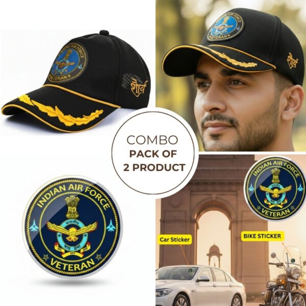 Along with the cap, the combo includes a Pack of 7 Premium Air Force Veteran Car & Bike Stickers, specially designed for vehicles, scooters, bikes, and helmets. The stickers are fade-resistant, weatherproof, and easy to apply, allowing veterans to display their pride with dignity.