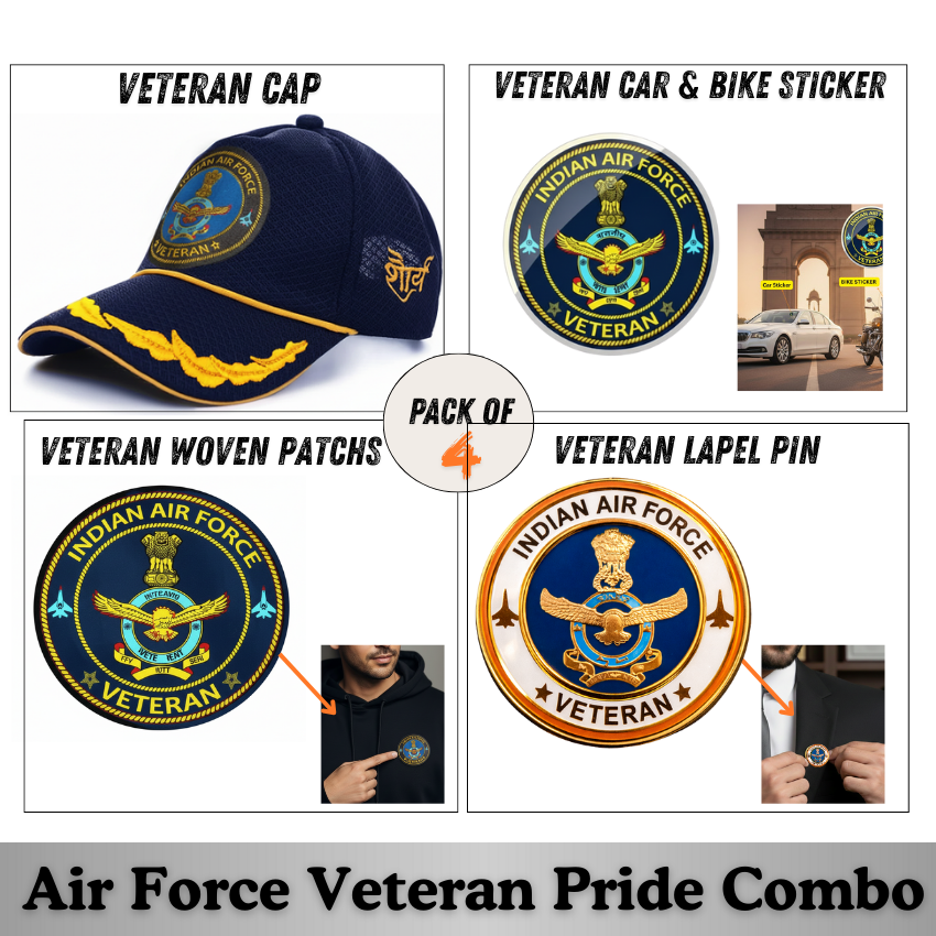 The Indian Air Force Officer Veteran Combo by Proud Forces is a premium honour set specially curated for Indian Air Force officers and veterans. This combo includes a premium officer-style Air Force baseball cap, force car & bike stickers, veteran woven patches, and a veteran blazer pin—designed to reflect pride, leadership, and service to the nation.