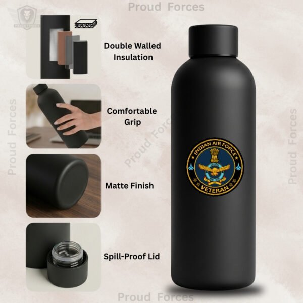 The Indian Air Force Veteran Insulated Water Bottle from Proud Forces is created for individuals who value practical performance along with national pride. Its premium matte black finish gives the bottle a refined and premium appearance, while the Indian Air Force Veteran sticker placed at the center adds a distinct patriotic identity inspired by honour, discipline, and service.