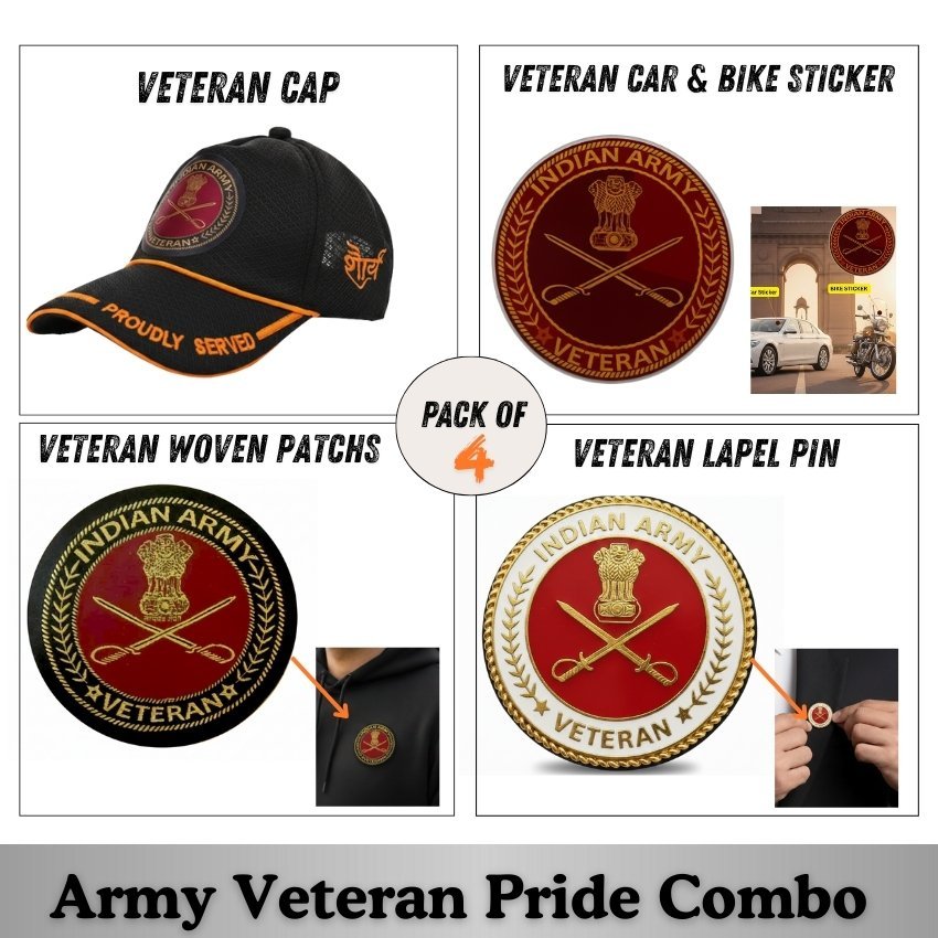The Indian Army Proudly Veteran Combo Products by Proud Forces is a premium pride set featuring a Proudly Veteran themed Army baseball cap, force car & bike stickers, veteran woven patches, and a veteran blazer pin—designed to honour courage, service, and lifelong dedication to the nation.