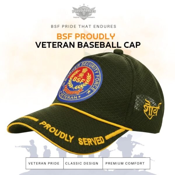 Pay tribute to the bravery, discipline, and dedicated service of Border Security Force (BSF) personnel with the Premium Quality BSF Proudly Veteran Baseball Cap (Olive Green Color) from Proud Forces. Crafted with purpose and respect, this cap is more than headwear—it is a symbol of honour, resilience, and commitment to the nation.