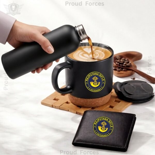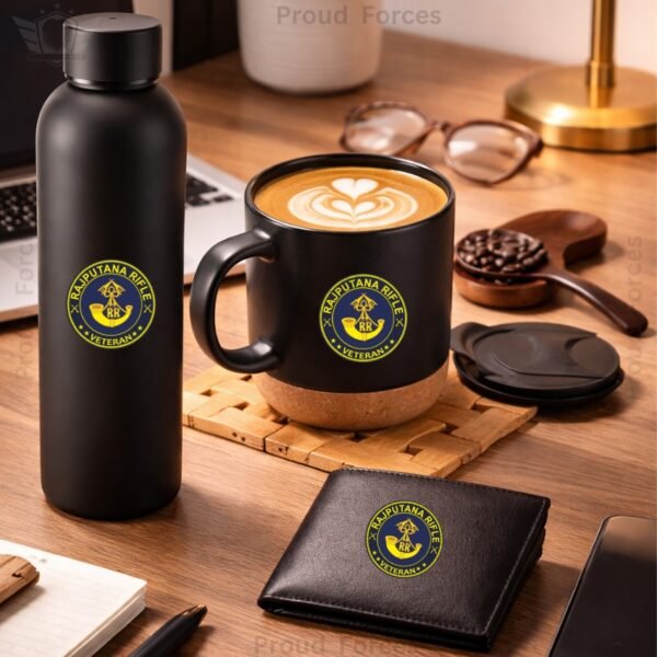 The Rajputana Rifle Veteran Premium Combo Pack of 3 – Bottle, Coffee Mug & Leather Wallet from Proud Forces is made for people who prefer useful and premium products for everyday use. This combo includes three practical items: a vacuum insulated matte finish water bottle, a premium matte black coffee mug, and a black leather wallet. All three products carry a centered Rajputana Rifle Veteran sticker, giving the combo a uniform premium appearance.