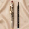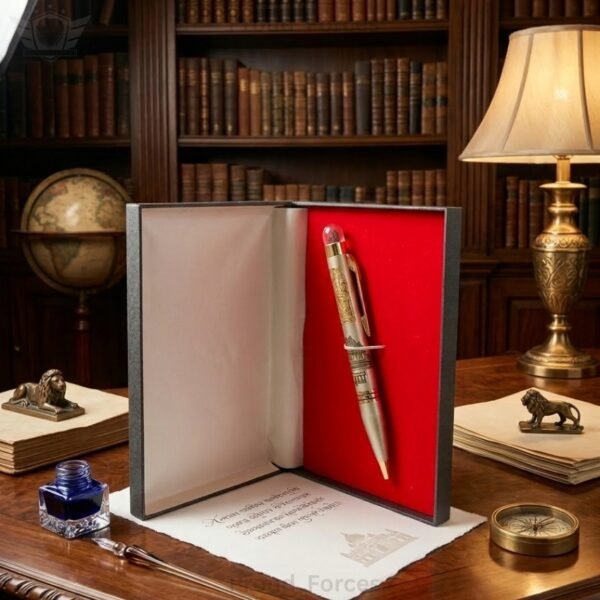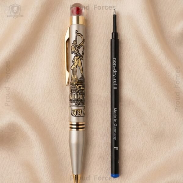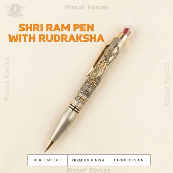 The Shri Ram Pen with Rudraksha from Proud Forces is a premium spiritual writing accessory designed with devotional detailing and elegant finish. The pen body features sacred artwork inspired by Shri Ram, including temple-style engraving and fine metallic design elements that make it visually unique and meaningful. Its Rudraksha-inspired top detail adds spiritual value, making it suitable for daily use, gifting, and personal collection. The pen is fitted with a NON-DRY refill with Made in Germany F technology, helping provide smooth ink flow and reliable writing performance for regular use.