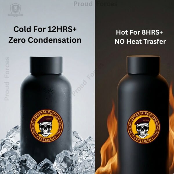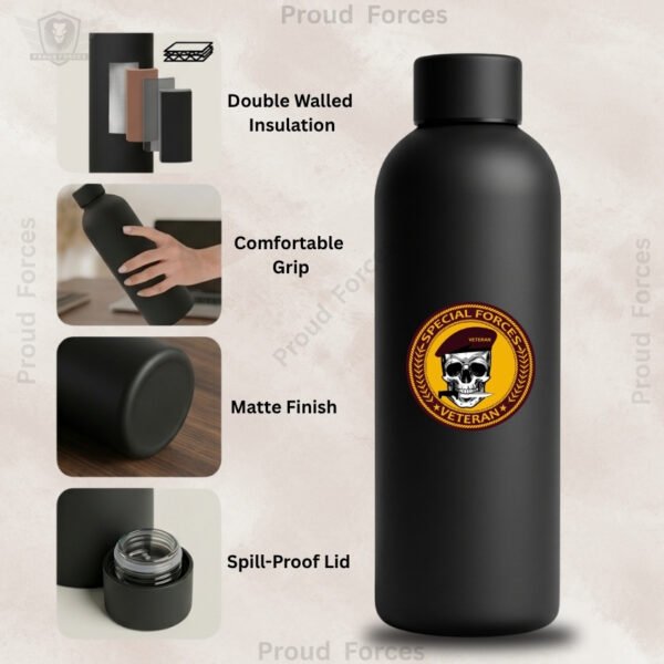 The Special Forces Veteran Insulated Water Bottle by Proud Forces is a premium matte black stainless steel bottle designed for everyday durability, reliable temperature retention, and identity-driven style. Featuring a centrally placed Special Forces Veteran sticker, this bottle offers a sleek premium finish and practical performance, making it suitable for office use, travel, workouts, and daily routine.