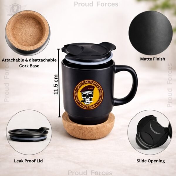 The Special Forces Veteran Matte Finish Coffee Mug with Cork Base by Proud Forces is a premium black matte finish mug designed for daily comfort, practical use, and veteran-inspired pride. Featuring a centrally placed Special Forces Veteran sticker, it comes with an attachable and detachable cork base, making cleaning simple and convenient. The leak-proof lid with slide opening allows easy sipping, making this mug perfect for tea, coffee, and other beverages at home, office, or while travelling.