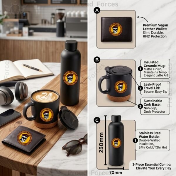The Special Forces Veteran Premium Combo Pack of 3 – Bottle, Coffee Mug & Leather Wallet by Proud Forces is a practical premium combo made for daily use. This set includes a matte finish insulated bottle, a matte black coffee mug, and a genuine leather wallet, all designed with a centered Special Forces Veteran sticker for a matching premium look. It is suitable for office, travel, home, and gifting.
